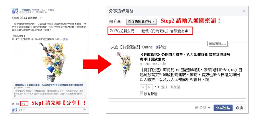 - 轉貼【分享】置頂文章《臉書分享贏啟動碼》後,並於分享留言區寫下『通關密語:7/17(四)朋友們!一起玩《狩龍戰紀》當馴龍高手』即有機會獲得《狩龍戰紀》CCB封測啟動碼一組唷!